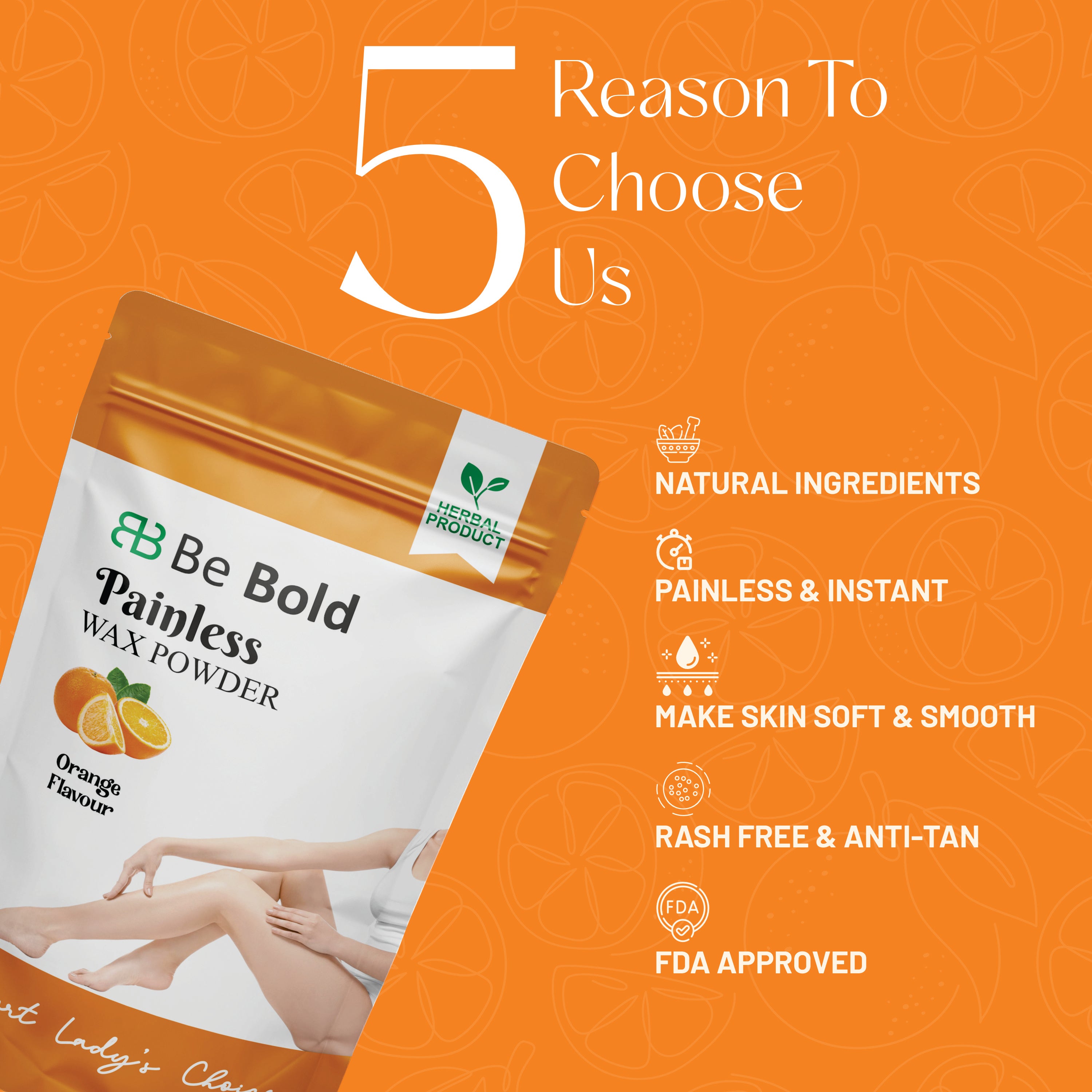 Get silky-smooth skin the painless way! Be Bold Painless Wax Powder (Orange Flavour) is enriched with natural orange extracts and herbal ingredients to gently remove unwanted hair. The refreshing citrus fragrance keeps your skin feeling fresh, soft, and radiant after every use. Perfect for women who want quick, easy, and painless hair removal at home.
