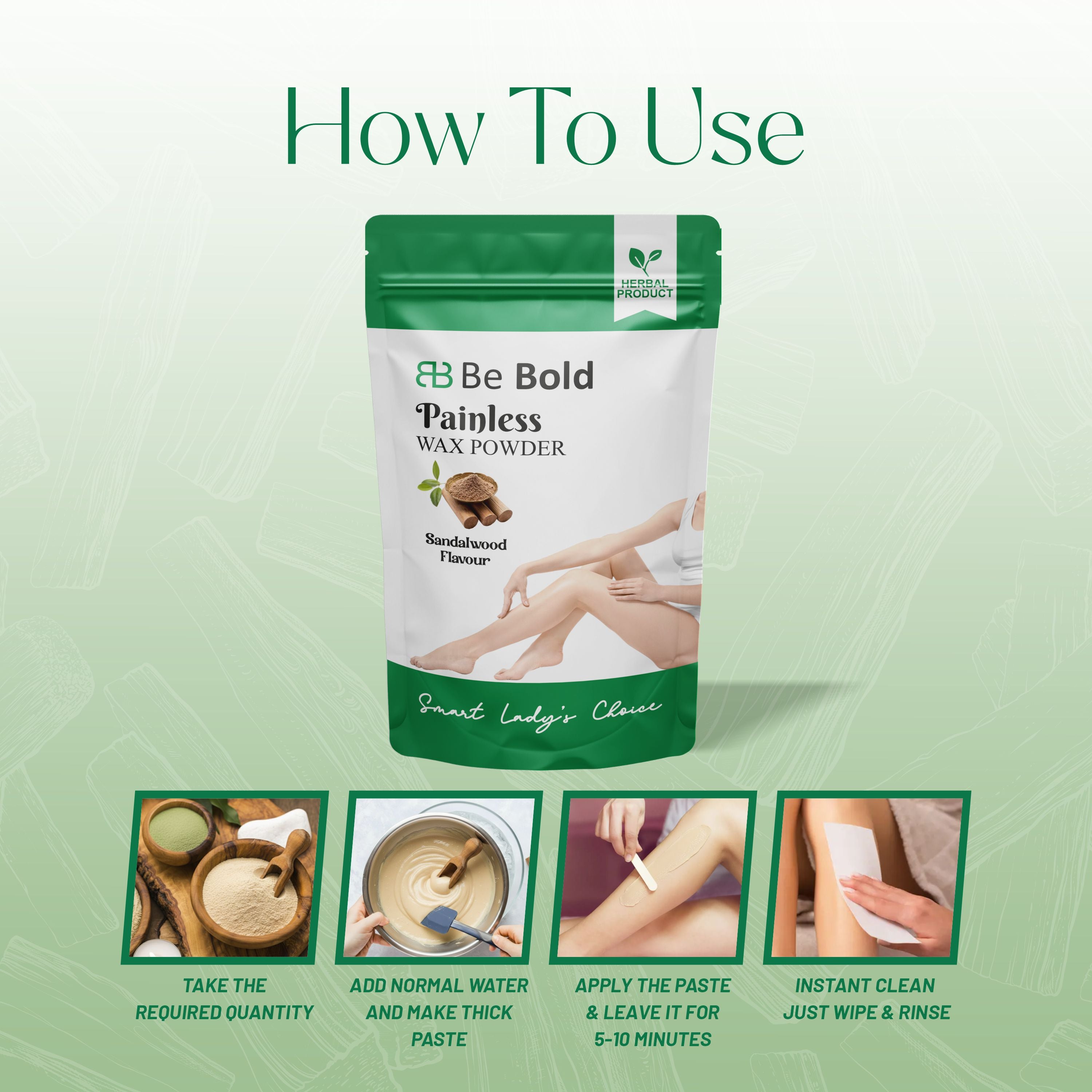 Say goodbye to painful waxing! Be Bold Painless Wax Powder (Sandalwood Flavour) is a natural, herbal-based solution for easy and effective hair removal. Enriched with sandalwood essence and skin-soothing ingredients, this wax powder gently removes unwanted hair while leaving your skin smooth, soft, and refreshed. Ideal for sensitive skin.